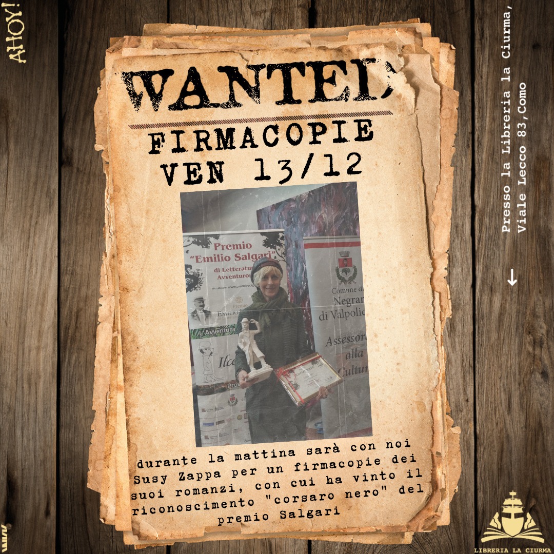 “Durante la mattinata sarà con noi Susy Zappa, per un firmacopie dei suoi romanzi, con cui ha vinto il riconoscimento “Corsaro nero” del premio Salgari”.