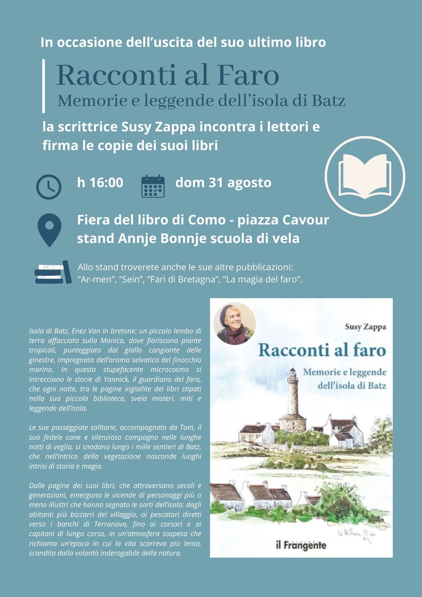 Susy Zappa presenta l’ultimo libro della saga sui Fari di Bretagna. Yannick, il guardiano del faro, ogni notte, tra le pagine ingiallite dei libri stipati nella sua piccola biblioteca, svela misteri, miti e leggende dell’isola.