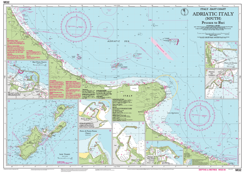For this 2015 edition the chart has been fully updated throughout. Revised depths are shown, particularly at Ortona and Bari Porto Nuovo, and harbour developments are shown at Ortona and Isole Tremiti. A new plan of Marina di San Pietro (Termoli) has been added.