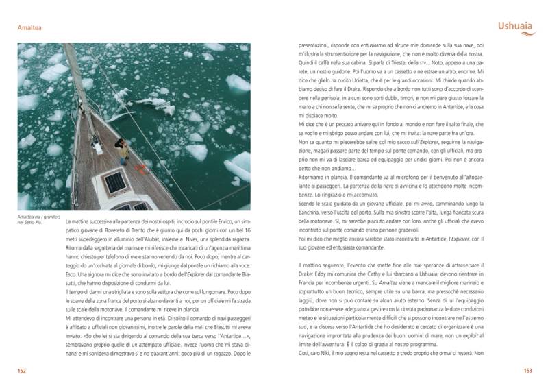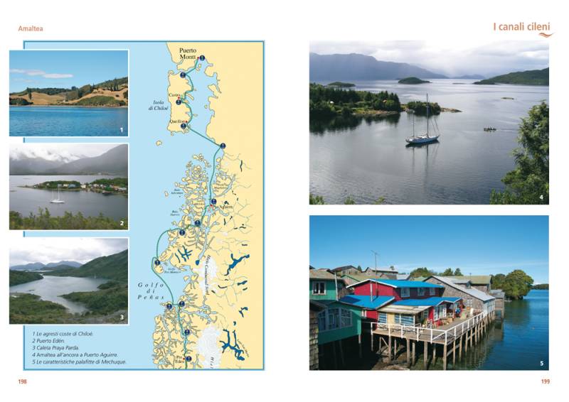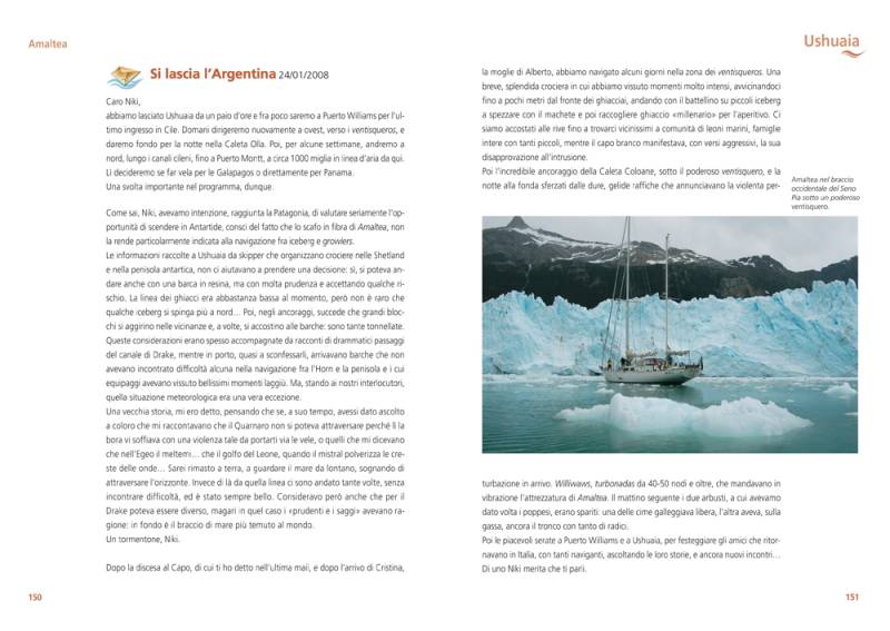 Quando Amaltea, nel settembre 2005, rientra a Trieste da un viaggio di tre anni intorno al mondo, molti pensano che la stagione delle sue navigazioni oceaniche sia conclusa. Non è così. Dopo tredici mesi lo yacht della Triestina della Vela ritorna in Atlantico e mette la prua a sud: le Canarie, Capo Verde, poi il Brasile e l’Argentina. Raggiunta l’estremità meridionale del continente latinoamericano, Amaltea doppia per la seconda volta Capo Horn, naviga nello scenario imponente e suggestivo della Terra del Fuoco, dominato dai ghiacciai della cordigliera Darwin, ed entra nel Pacifico. Risale quindi i canali cileni con un clima caratterizzato dalla pioggia e dai rabbiosi venti delle alte latitudini, in un ambiente naturale tanto affascinante quanto poco conosciuto.