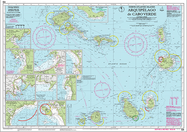 On this edition the chart specification has been improved to show coloured light flashes. Depths have been updated from the latest available surveys where available. Completed harbour works at Palmeira (Sal) are included as are the latest reclamation works at Praia (Santiago). There has been general updating throughout.