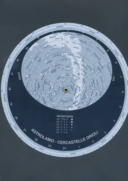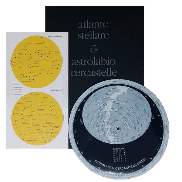 L’Atlante stellare rappresenta il cielo notturno con due carte polari e una carta che si avvolge sulla sfera celeste lungo l’equatore. L’Astrolabio-cercastelle è realizzato in materiale plastico; dotato di un’accurata mappa celeste che permette di seguire il moto delle stelle sulla volta celeste.