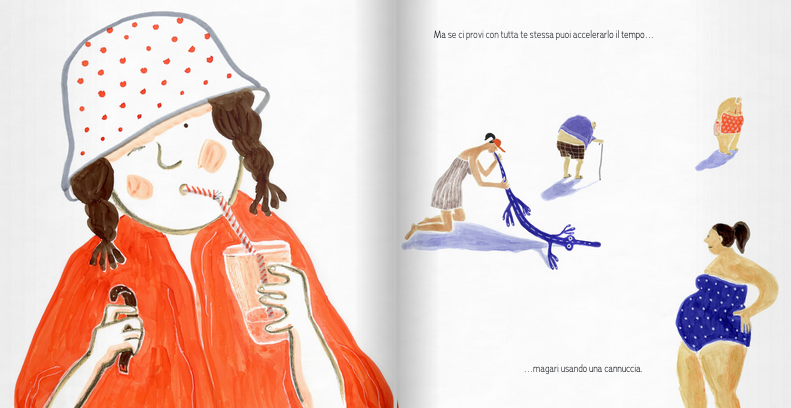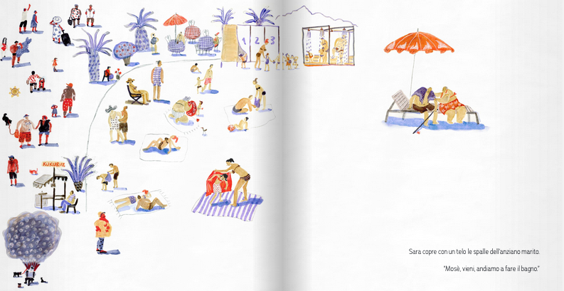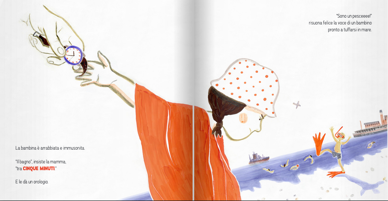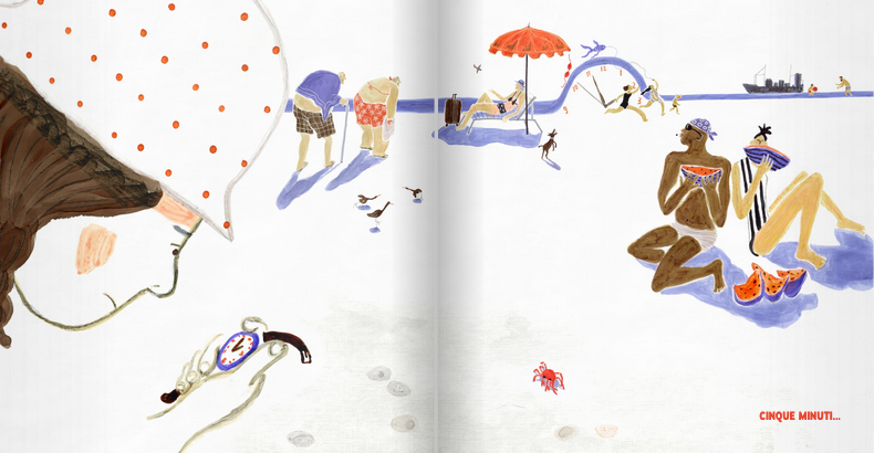 Quanti sono cinque minuti? Volano in un secondo oppure scorrono lentamente come l’eternità? Partendo dal senso di frustrazione di una bambina cui la madre vieta di entrare in mare per cinque minuti, l’albo affronta la diversa percezione del tempo nei bambini e in tarda età, intrecciando delicatamente la storia della protagonista con quella di Sara e Mosè. «Il tempo può anche scomparire. Basta soffiare forte sulle lancette di un orologio.»