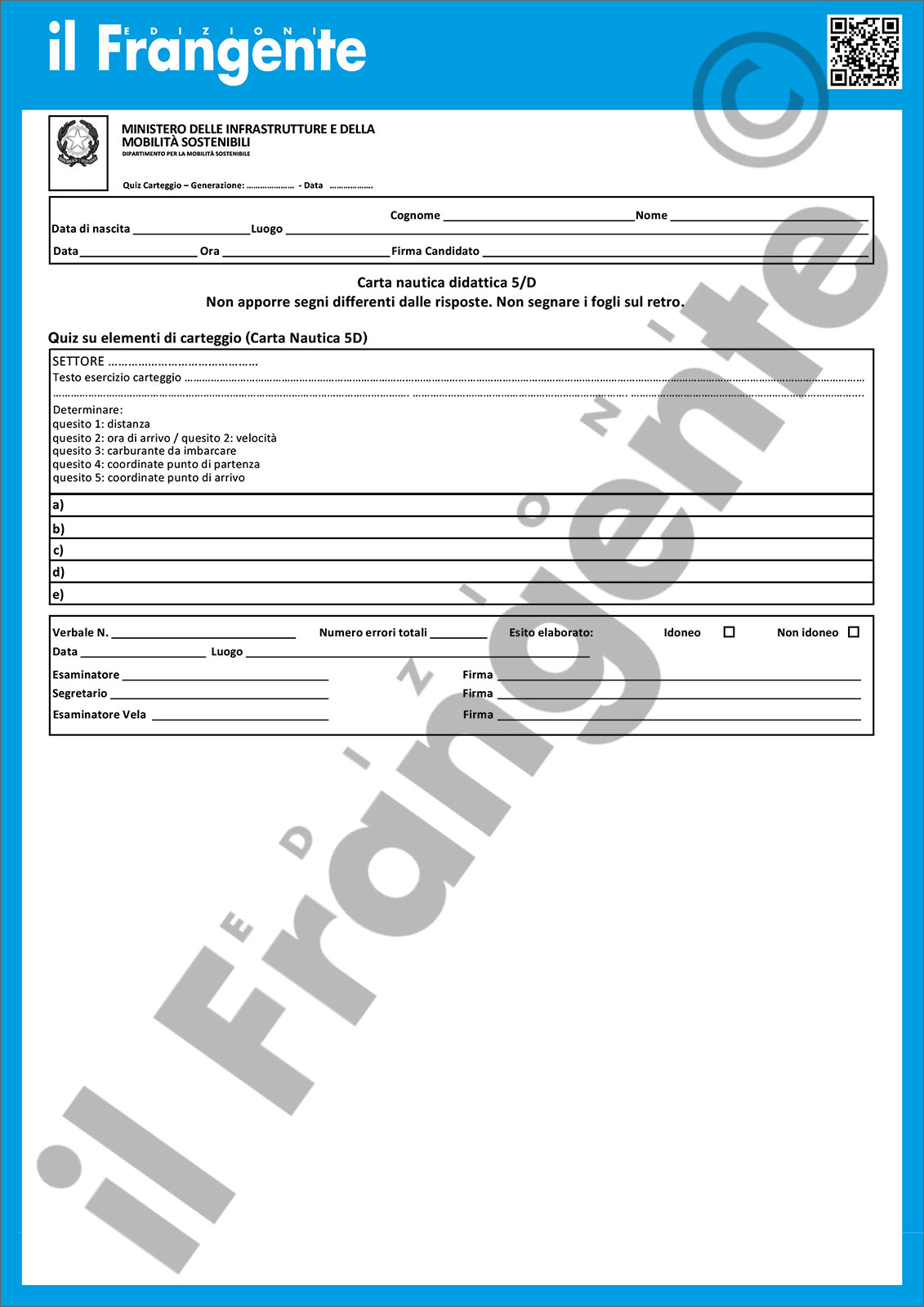 – blocco con moduli ministeriali per esame di carteggio patente nautica entro 12 miglia da 25 fogli