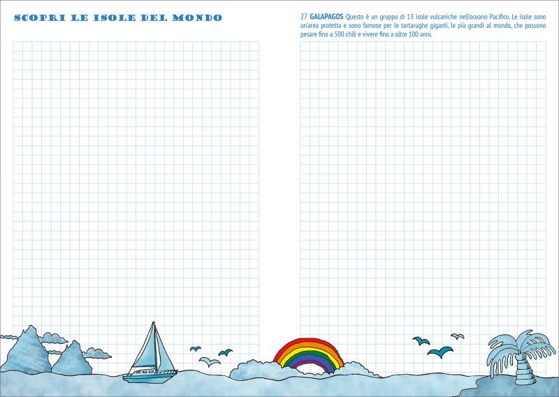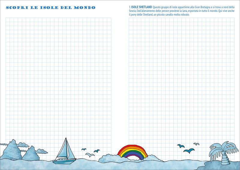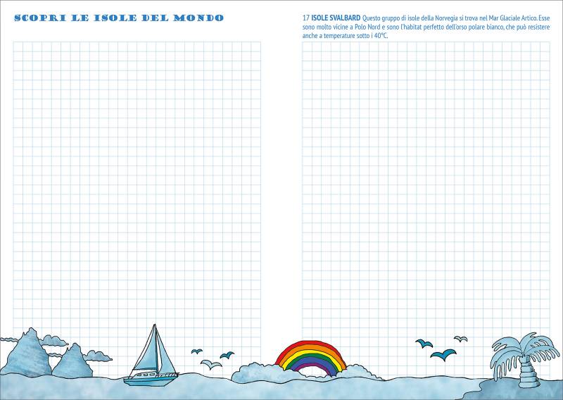 Per stimolare anche la loro curiosità, ogni pagina riporta una breve, semplice descrizione di isole sparse nel mondo, dal Mediterrano agli oceani, selezionate per una loro caratteristica distintiva culturale, storica o naturalistica. Si passa dunque dalla vicina Itaca, all’isola di Terranova o alle isole Cook nel Pacifico.