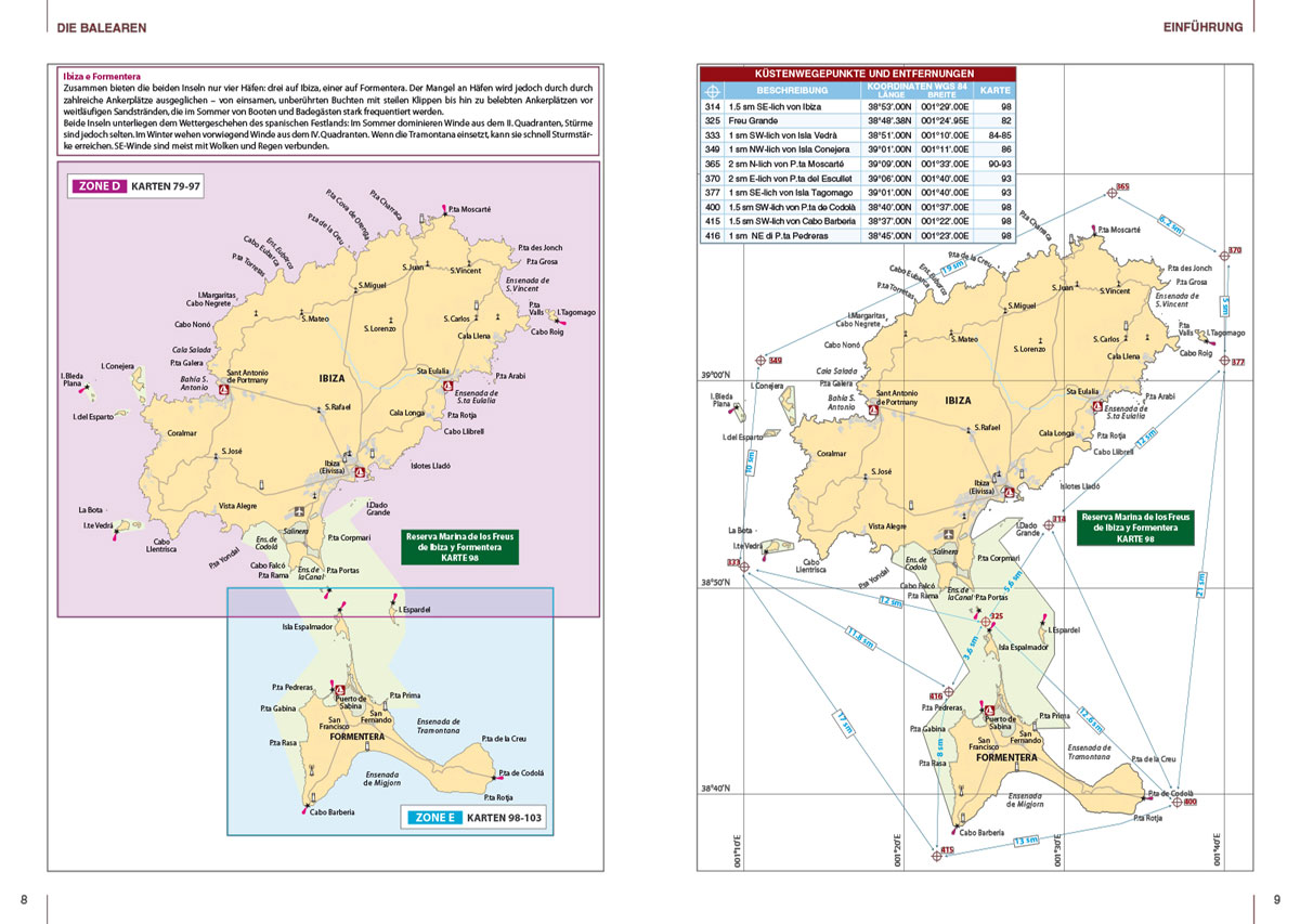 Dieses Küstenhandbuch beschreibt die Balearen, die fünf Insel umfasst: Menorca, Mallorca, Cabrera, Ibiza und Formentera. Sein Schwerpunkt liegt auf die 103 detaillierten Karten, die Häfen, Anlegestellen und Ankerplätze umfassend beschreiben. Ergänzt werden diese durch eine Übersichtskarte mit Entfernungen und Hauptrouten sowie durch Seekarten der Navigationszonen.