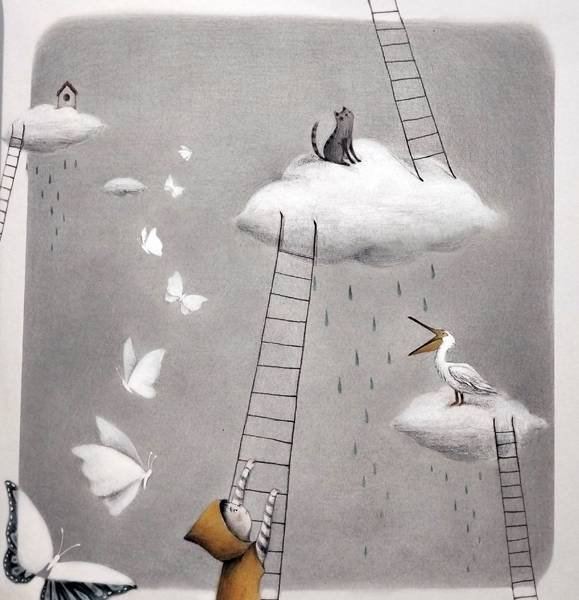 Mentre fuori piove ed è grigio, Pagio dentro casa colora… riproducendo tutti quei colori che tanto gli piacciono. E se il cielo non piovesse? gli viene da chiedersi mentre una goccia d’acqua bagna il suo foglio. Una curiosa e spontanea ipotesi nasce così dagli interrogativi divertenti e intelligenti che solo un bambino (o un adulto “fanciullino”) riesce a porsi.