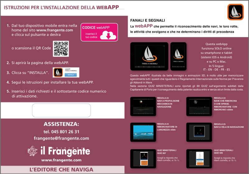 3. Quiz ministeriali Sono riportati tutti gli 88 quiz che riguardano fanali e segnali, adottati dalle Capitanerie di Porto secondo il nuovo programma ministeriale per il conseguimento della patente nautica entro ed oltre le 12 miglia. Un’utile funzione per esercitarsi in vista dell’esame, un’opportunità per tutti i naviganti che intendono affrontare il mare in modo consapevole.
