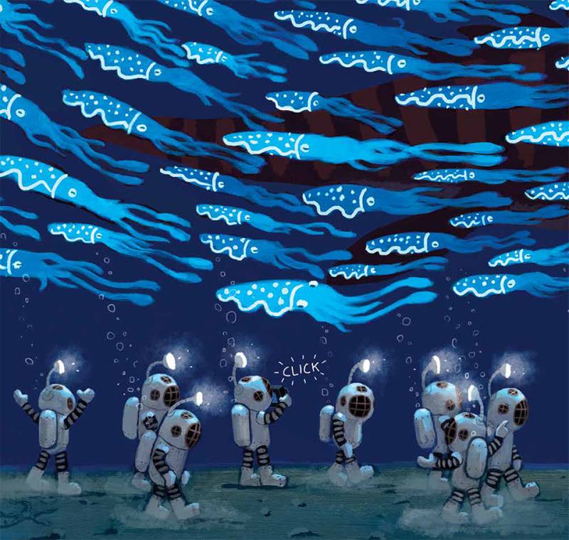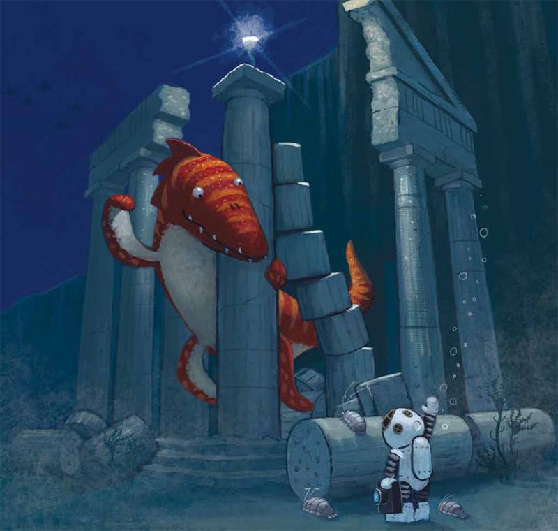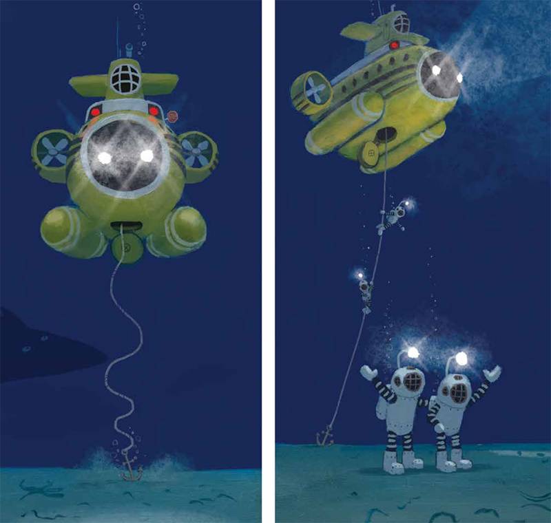 A bordo di un sottomarino giallo, un gruppo di bambini in tuta da sub è in gita scolastica sotto l’oceano. Gettata l’ancora, la scolaresca inizia a fare conoscenza con le creature marine: calamari luminescenti passano sulle loro teste e crostacei giganti fanno capolino da un vecchio relitto abbandonato sul fondale. Ma quando è il momento di tornare al sottomarino, un bambino si attarda a fare una foto a un forziere del tesoro e, all’improvviso, sprofonda in un crepaccio… Il piccolo verrà presto ritrovato ma, nel frattempo, avrà fatto amicizia con una creatura marina misteriosa e avrà trovato niente meno che le rovine dell’antica città di Atlantide! John Hare, in questo suo nuovo splendido libro senza parole, invita i bambini a usare la propria immaginazione e a sentirsi protagonisti di un’avventura incredibile che regala sorprese fino all’ultima pagina.