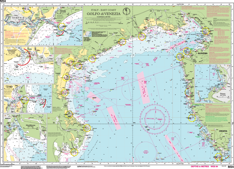 For this 2015 edition the chart has been fully updated throughout showing changes to depths, navigational aids, areas and limits where appropriate. Construction works for the MOSE Project tidal control barriers are shown at Venezia and Chioggia, as are harbour developments at Monfalcone and Trieste.