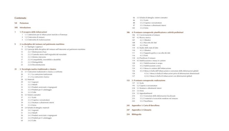 Il volume tratta il tema dell’intervento sulle imbarcazioni in legno coniugando la disciplina del restauro architettonico con le tecniche utilizzate in cantiere, aspetti quotidianamente affrontati nell’attività professionale dell’autore. Per ogni componente sono presentate le diverse problematiche e le relative soluzioni, analizzando sia prassi comuni sia tecniche più attente e innovative che tutelano maggiormente la conservazione dello stato di fatto e il messaggio di testimonianza storica. Armatori, cantieri, teorici della disciplina e amatori troveranno spunti e risposte utili ad indirizzare le proprie scelte, garantendo un processo di intervento consapevole e di provata efficacia.