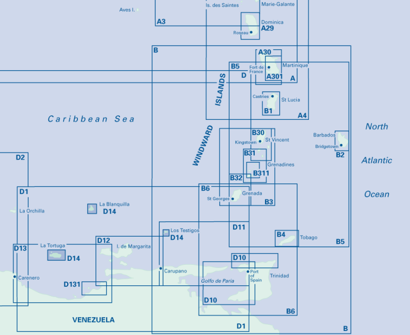 Imray-Iolaire charts for Caribbean are widely acknowledged as the best available for the cruising sailor. They combine the latest official survey data with first-hand information gathered over 60 years of research by Don Street Jr and his wide network of contributors. Like all Imray charts, they are printed on water resistant Pretex paper for durability, and they include many anchorages, facilities and inlets not included on official charts.