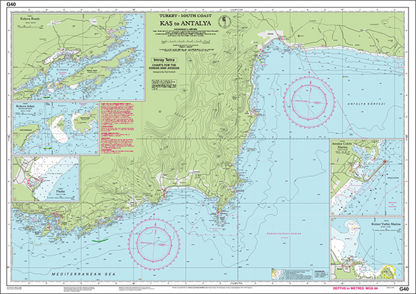 For this 2014 edition the chart has been fully updated and modernised. The latest known depths are shown around Kas, Kekova Roads and Antalya Harbour. Harbour depths at Üçagiz are also displayed, as are the recently deployed AIS transmitters across the chart.