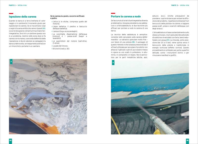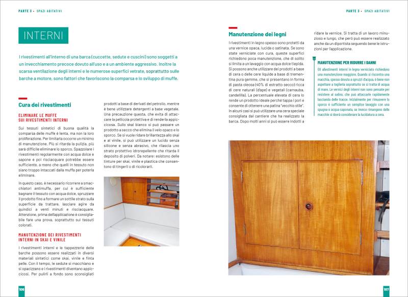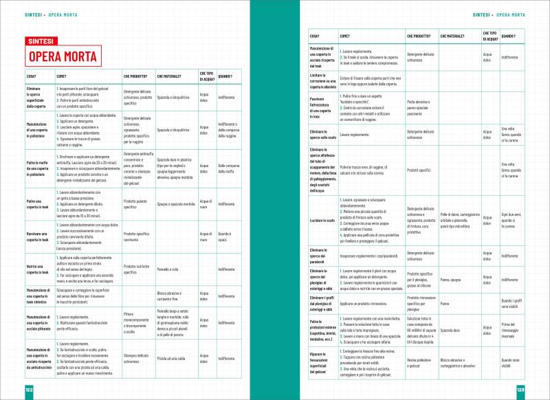 Si inizia dall’opera morta, ad esempio: come lavare a regola d’arte la coperta, che sia in poliestere, teak, lega d’alluminio o acciaio; come ridare lucentezza allo scafo e al gelcoat; come mantenere in buono stato i parabordi, gli oblò e le protezioni esterne; come riparare i piccoli danni occorsi durante la navigazione o come ripitturare lo scafo nel rispetto delle regole.
