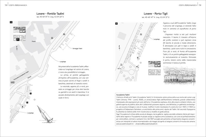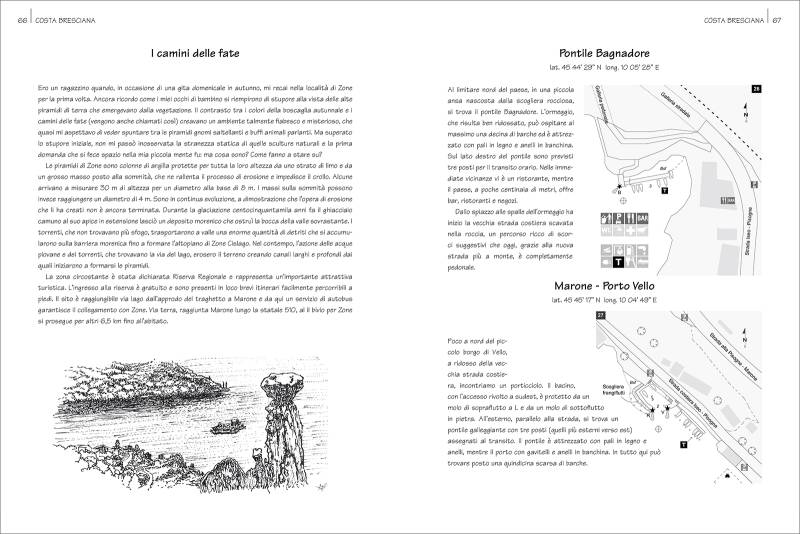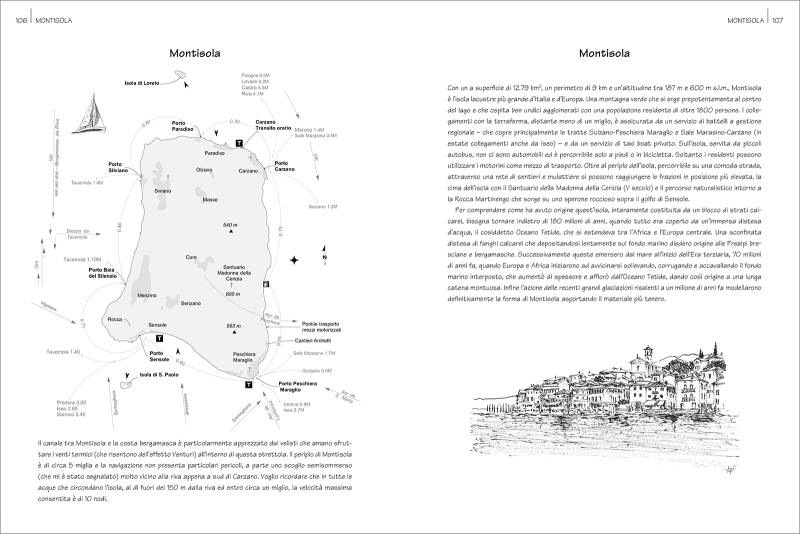 Pagina dopo pagina il diportista è condotto alla scoperta del piccolo Sebino esplorandone gli aspetti nautici e culturali. All’introduzione storica e meteorologica, che presenta l’area di navigazione e in particolare i suoi venti, segue la descrizione dettagliata di approdi, porti e ancoraggi, di cui si riportano i servizi e i venti di traversia, il tutto completato da rotte, distanze e waypoint utili per l’atterraggio. Oltre a queste informazioni puramente pratiche e tecniche, questo portolano è caratterizzato da un’interessante rassegna di notizie e curiosità che riguardano la storia, le tradizioni e le risorse peculiari di questo lago. I testi sono corredati da numerosi quadri d’insieme dell’area di navigazione, da piani di approdi e porti turistici, il tutto arricchito da originali disegni a china.