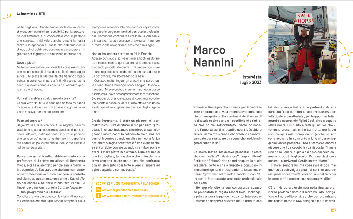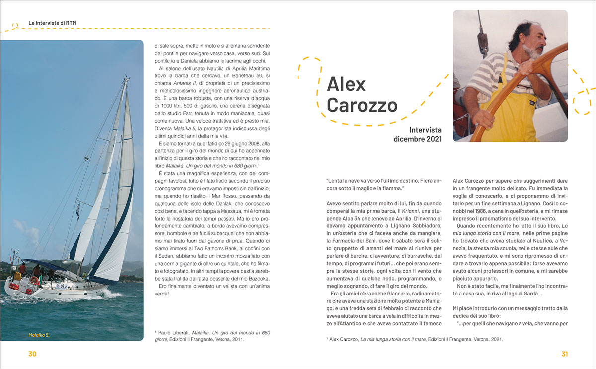 Dal 2021 gestisce il sito Rotte di Tutto il Mondo, un pozzetto virtuale di incontri con chi va per mare, e nella rubrica “Il personaggio del mese” intervista skipper, navigatori e personaggi che hanno dato al mare il loro contributo. Spirito irrequieto, provocatore, incisivo, passionale, abituato a essere davanti al tempo, ha costruito rapporti di autentica amicizia e stima sia in mare che a terra.