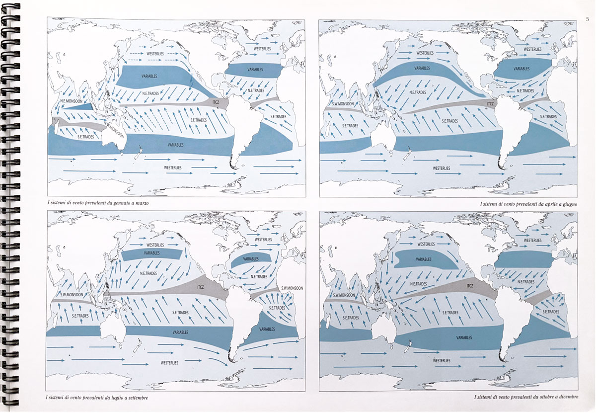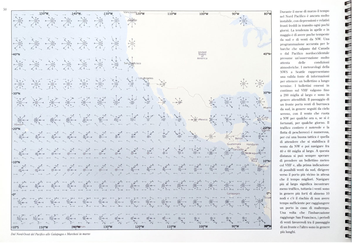 69 carte dettagliate delle rotte oceaniche più battute facilitano la programmazione di una rotta che sfrutti le condizioni di vento prevalente in quel periodo dell’anno.
