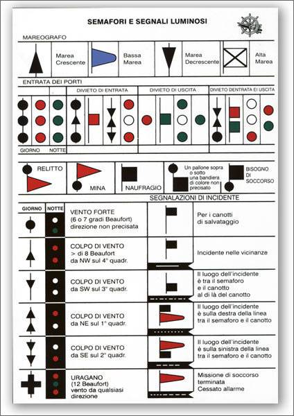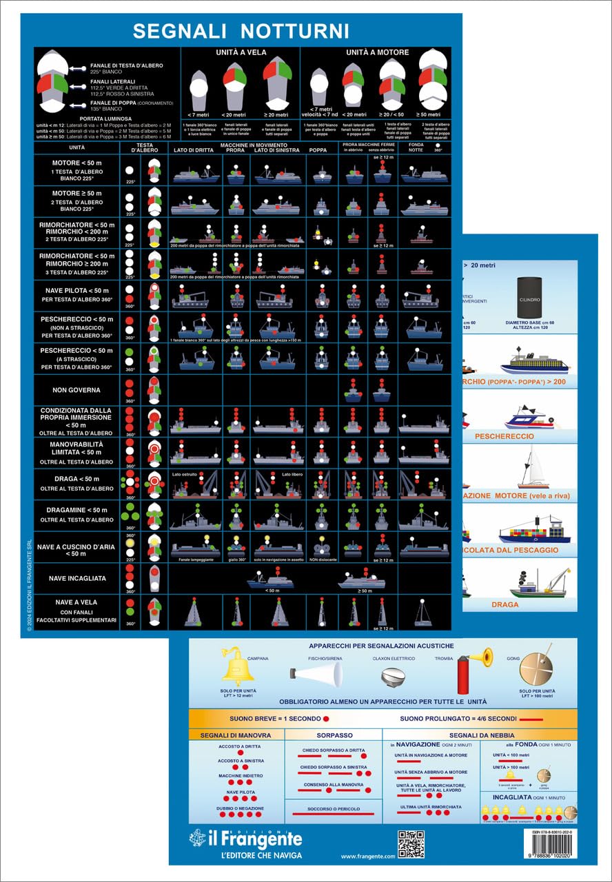 Una pratica scheda che illustra tutti i segnali visivi diurni e notturni come prescritti dal Colreg 72, regolamento internazionale per prevenire gli abbordi in mare.