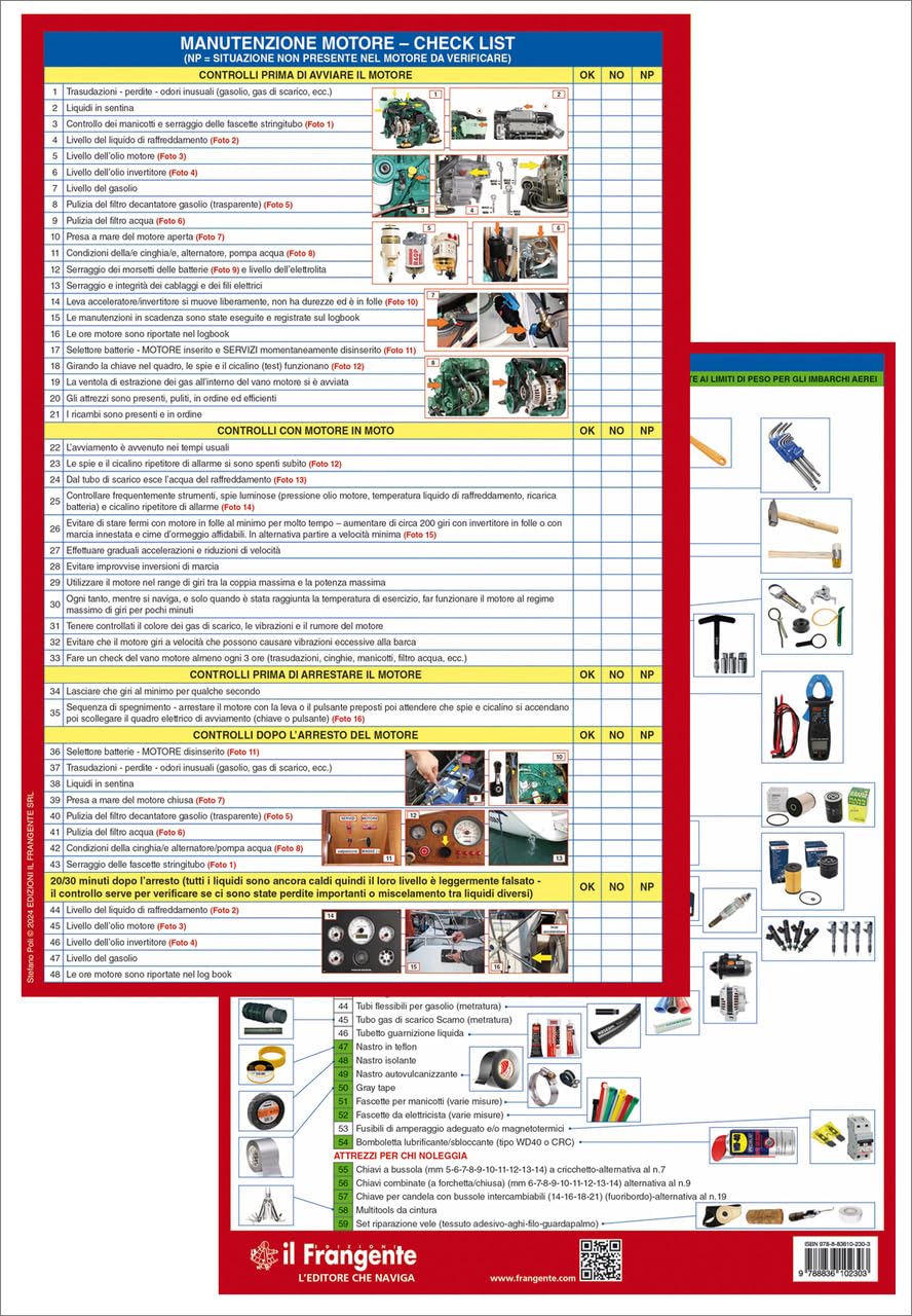 Su un lato sono riportati tutti gli attrezzi necessari per la manutenzione e i ricambi, sull’altro i controlli da eseguire prima dell’avviamento, con motore in moto, prima e dopo l’arresto del motore.