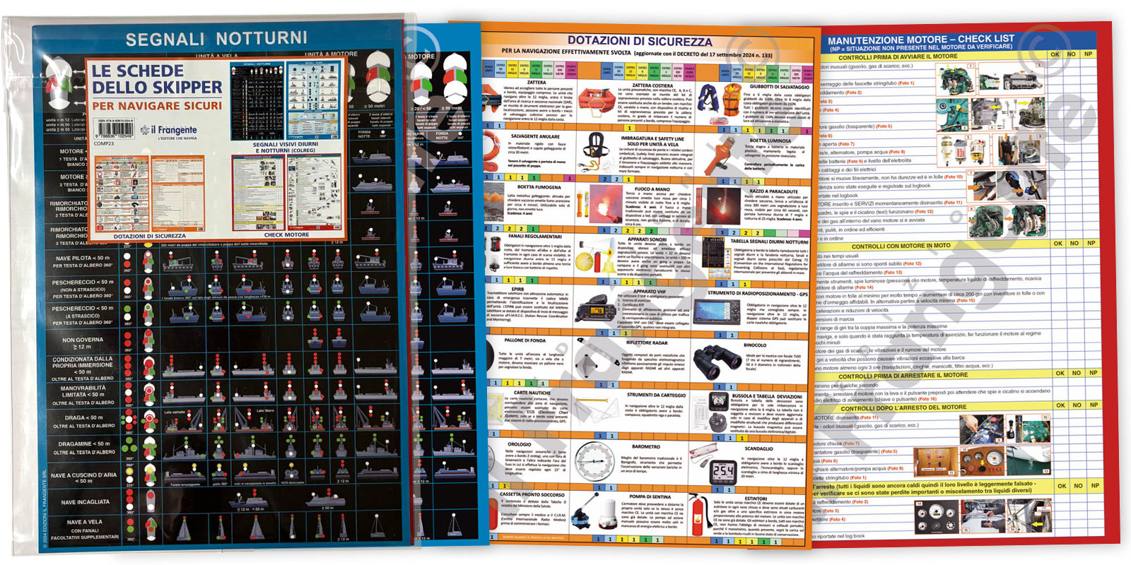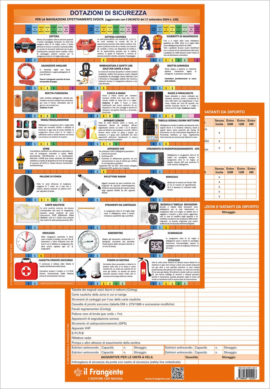Una pratica scheda da tenere sempre a bordo che illustra le dotazioni di sicurezza obbligatorie per la navigazione effettivamente svolta, differenziate a seconda della distanza in miglia dalla costa. In scheda vi sono degli spazi per inserire la quantità di ogni singola dotazione presente a bordo e la relativa posizione di stivaggio, affinché tutti i membri d’equi- paggio siano consapevoli della loro ubicazione. Sono indicate inoltre le dotazioni non obbligatorie, ma raccomandate ai fini della sicurezza a bordo, per imbarcazioni e natanti da diporto.