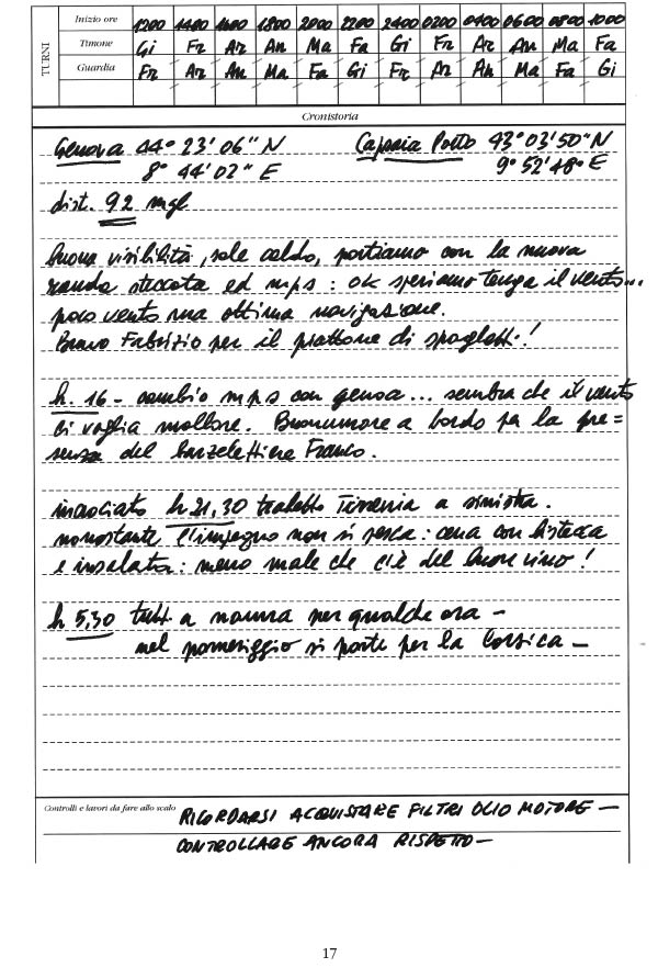 Sul Libro di bordo sono annotati la rotta seguita, le osservazioni meteorologiche, la composizione dell’equipaggio, il punto nave, gli interventi di manutenzione, il materiale imbarcato e in genere tutti i fatti inerenti alla navigazione. Si tratta in sostanza di un registro che il Comandante è tenuto a compilare quotidianamente.