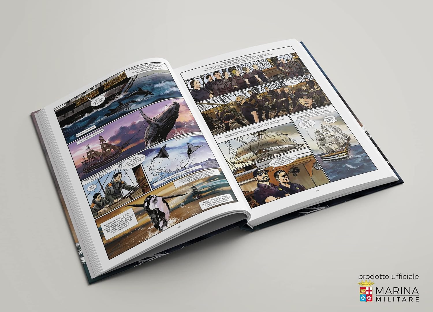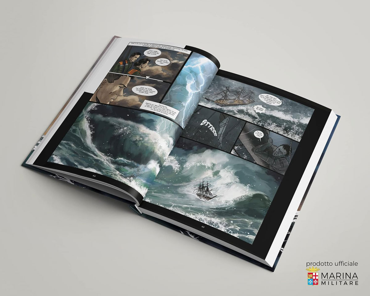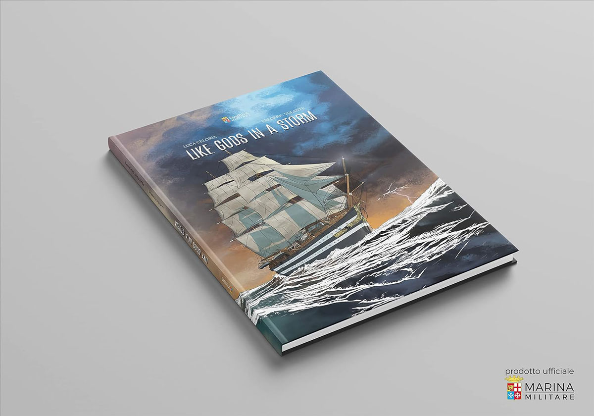 “Like suns through the fog, like gods in the storm”. This is the motto of the Kon-Tiki Class, created in 1965 onboard the Amerigo Vespucci, at the end of the training campaign for the cadets of the first class of the Livorno Naval Academy, the prestigious institution that for over one hundred and forty years has been training all the Italian Navy officers. That motto inspired the title of this graphic novel, which, with its wonderful panels in colour, tells an adventure that is fictional but not so much, a story that is intended to make the reader dream while keeping feet on the ground, or rather, on the deck. An adventure dedicated “to all those who never stop believing in their capacity to make their dreams come true”, to the sailors of yesterday, today and tomorrow, and in particular to those boys and girls who will be able to discover their future in the sea, with its unlimited opportunities.