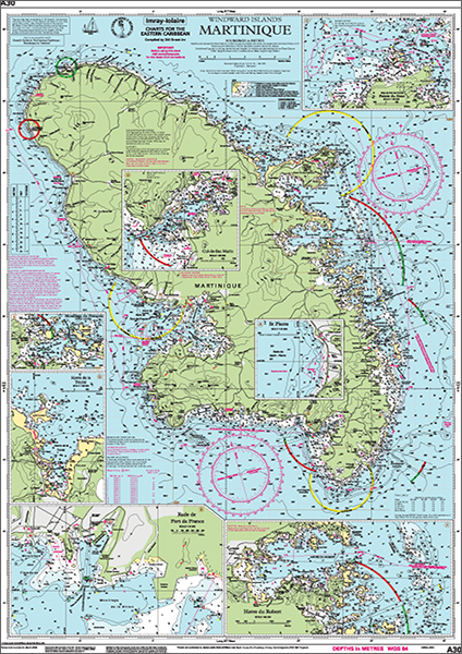 On this edition the chart specification has been improved to show coloured light flashes. The plan of Rade de Fort de France has been reschemed to include coverage of Marina L’Etang Z’Abricots. There has been general updating throughout.