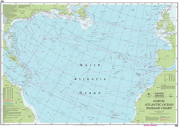 At a scale of 1:7,620,000 this chart covers the North Atlantic from Brazil to Newfoundland and Gibraltar to the Caribbean. It has been constructed on a conical projection that means that Great Circle tracks can be plotted as straight lines rather than curves. Chart 100 shows the main trend of depth contours, limits of ice, magnetic variations and keys routes as identified by Donald M. Street Jr.