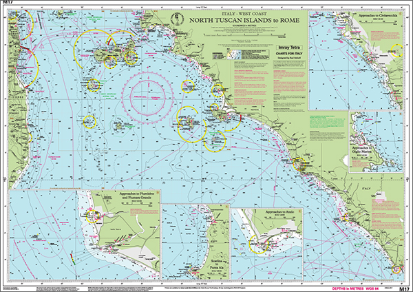On this 2017 the latest known depths have been applied. Harbour developments at Civitavecchia and Fiumicino are included as is the restricted area on the approach to Anzio. The Corsican Channel TSS is shown, as are the extents of Marine Protected Areas on this chart. The chart specification has been improved to show coloured light flashes. There has been general updating throughout.