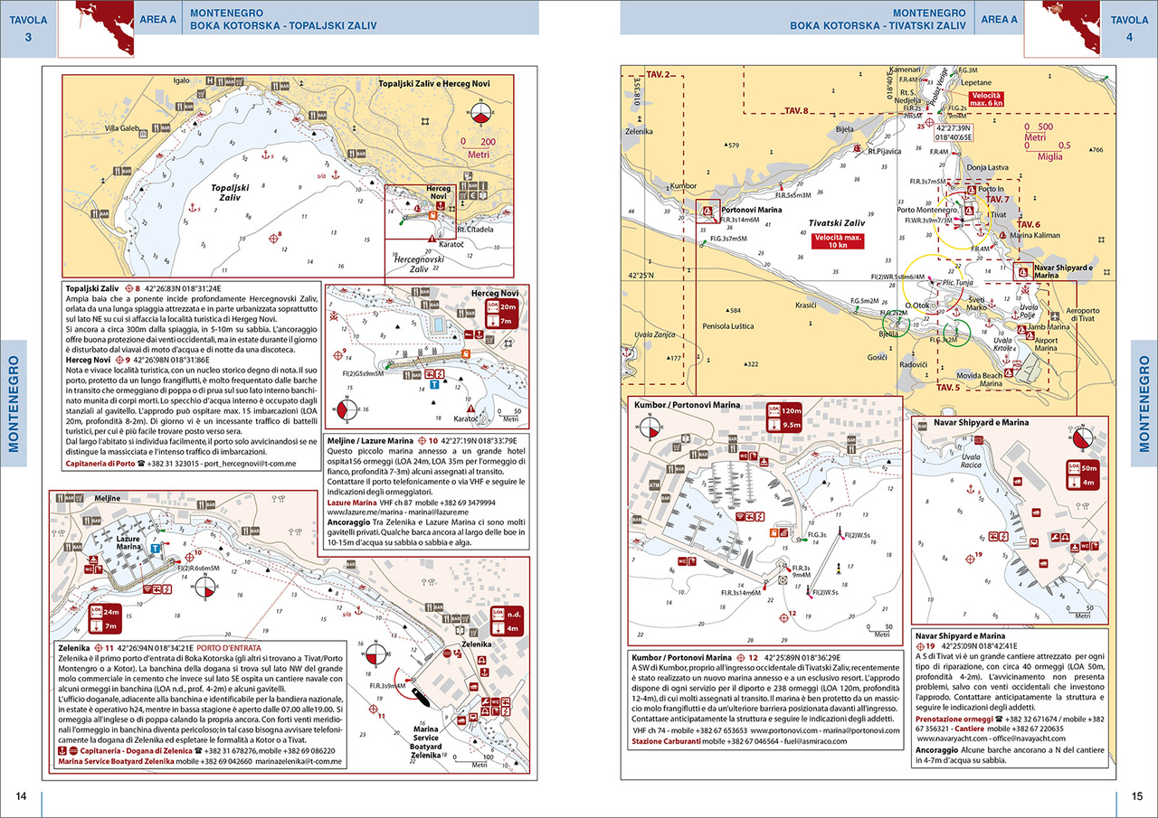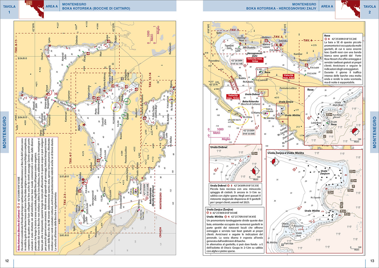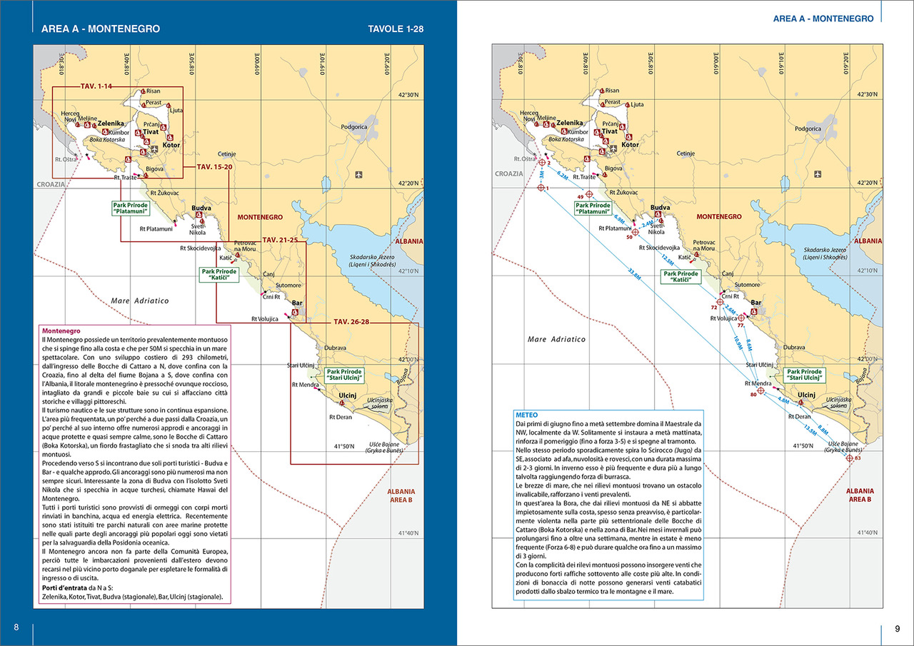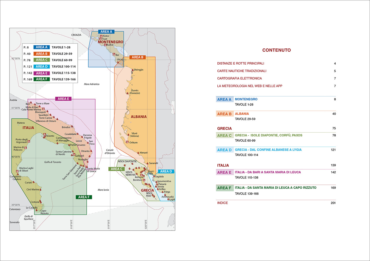 Questo portolano, costituito da 166 tavole cartografiche, descrive in dettaglio le coste del Montenegro e dell’Albania. Per completezza sono state inserite anche le aree di navigazione limitrofe che comprendono le coste ioniche dell’Italia da Bari fino a Capo Rizzuto, le isole di Corfù e Paxos e la costa greca continentale dal confine albanese fino a Ligia.