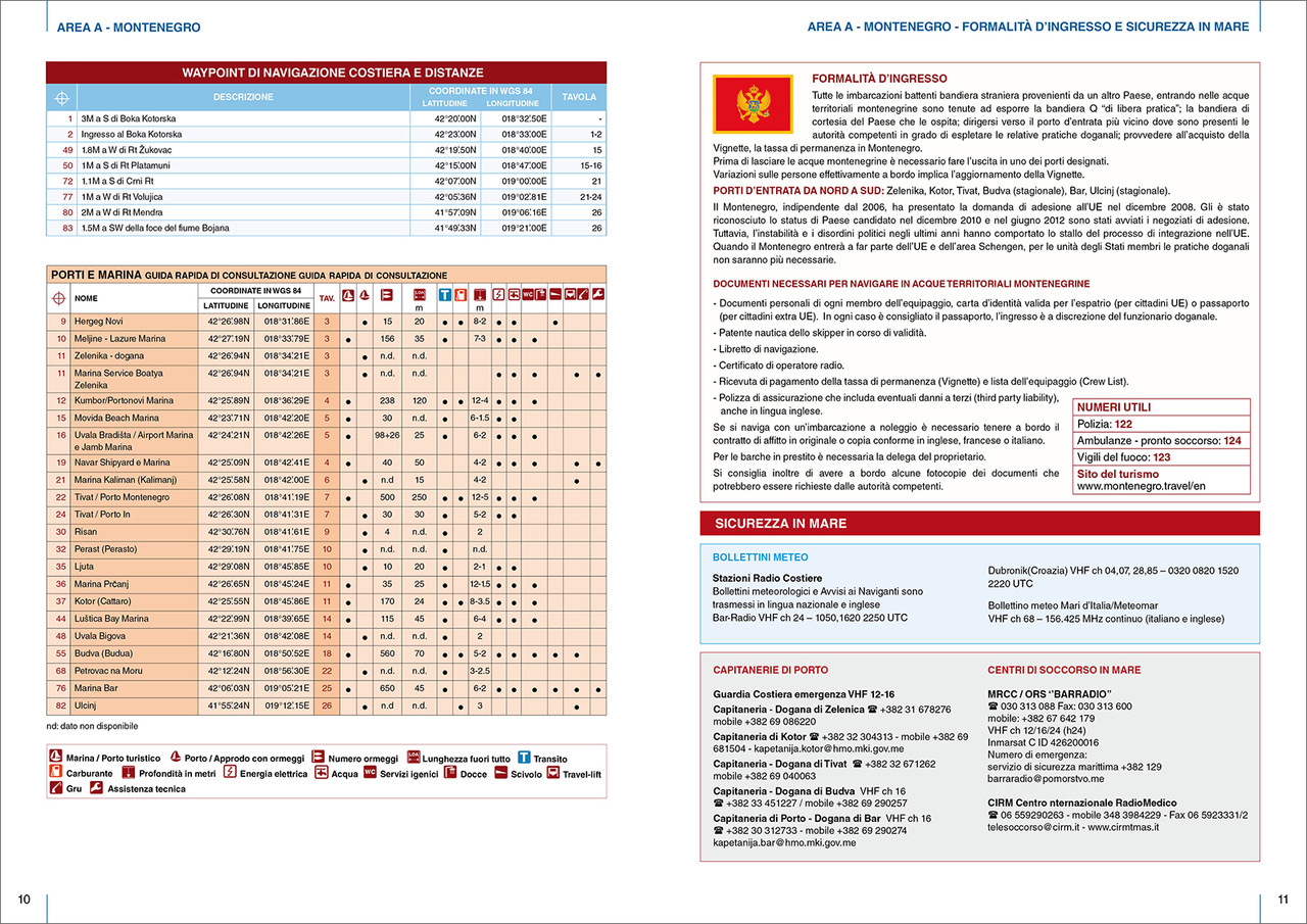 L’area di navigazione è suddivisa in sei macrozone, per ognuna delle quali è riportata una guida rapida dei principali porti e marina con i relativi servizi (erogazione acqua e corrente, carburante, assistenza tecnica, ecc.). Basta dunque un rapido sguardo per essere in grado di scegliere la meta a seconda della propria imbarcazione e delle condizioni meteo.