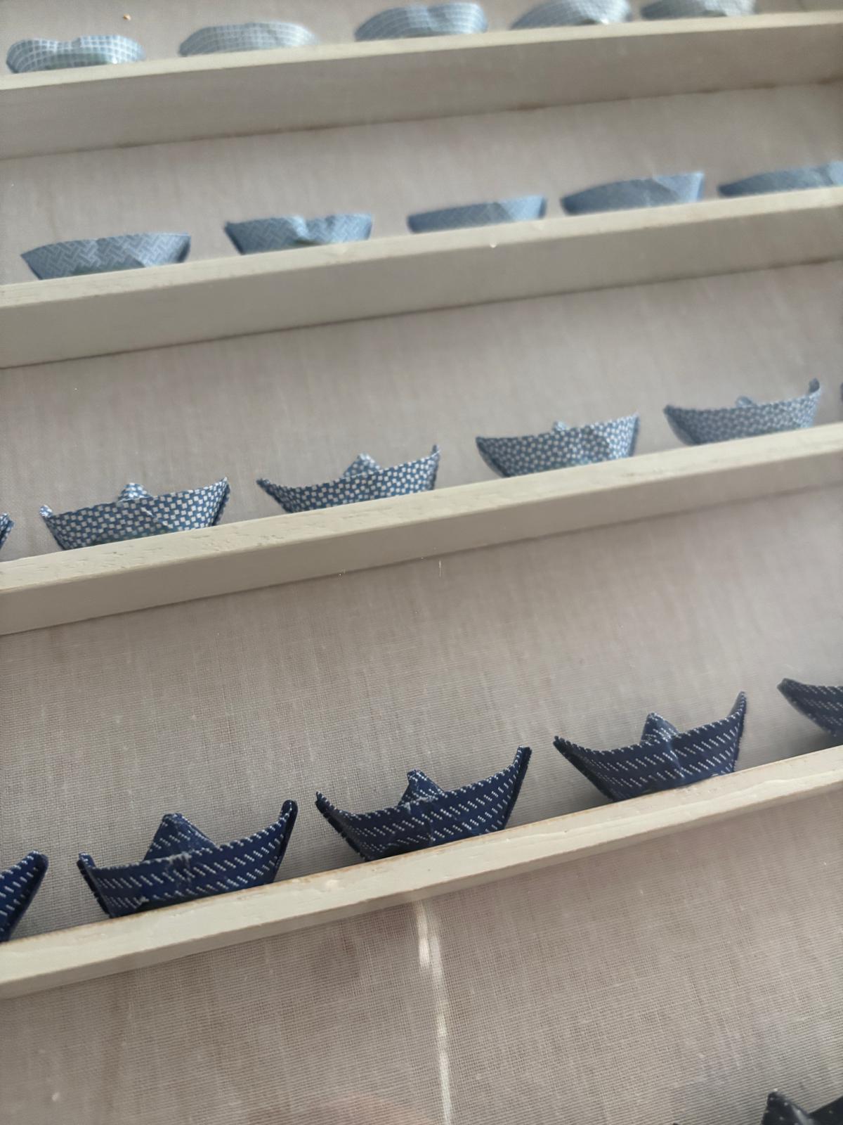 Sulle 7 mensole di colore bianco poggiano 49 barchette realizzate in miniatura a mano su carta colorata nelle sfumature dal blu al bianco.
