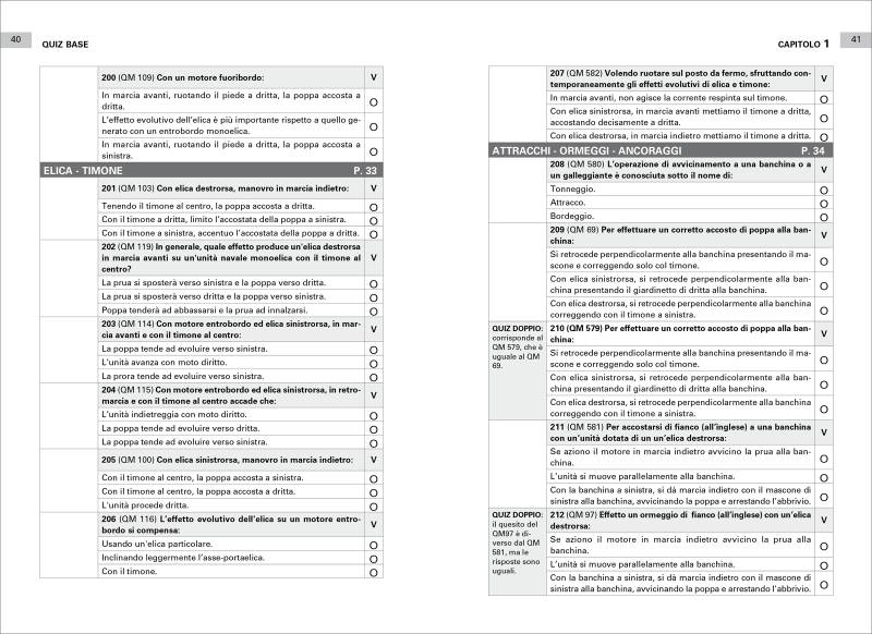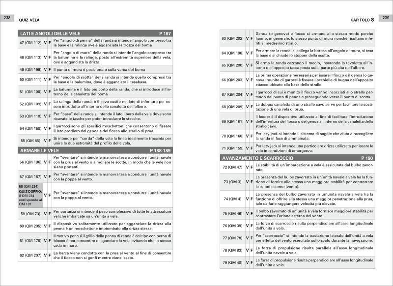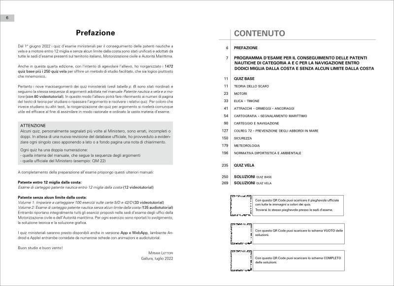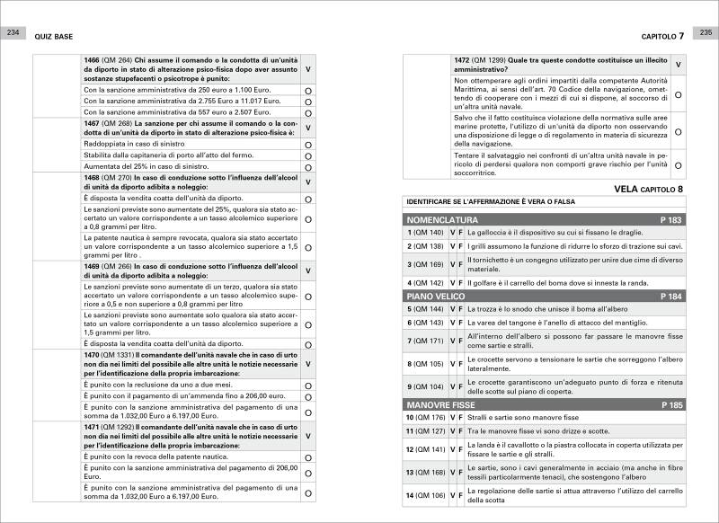 Questo manuale comprende tutti i quiz ufficiali – base e per la vela – organizzati per argomento didattico secondo la sequenza del testo di teoria di Miriam Lettori Patente nautica a vela e a motore. In questo modo l’allievo può affrontare lo studio in modo logico e progressivo, con la possibilità di richiamare facilmente le singole pagine per approfondimenti e ripasso. Un metodo che risulta prezioso anche per chi utilizza altri testi di teoria, perché consente di assimilare l’intero programma ministeriale seguendo un percorso razionale e ordinato.