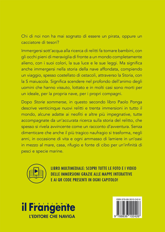 Dopo Storie sommerse, in questo secondo libro Paolo Ponga descrive venticinque nuovi relitti e trenta immersioni in tutto il mondo, alcune adatte ai neofiti e altre più impegnative, tutte accompagnate da un’accurata ricerca sulla storia del relitto, che spesso si rivela avvincente come un racconto d’avventura. Senza dimenticare che anche il più tragico naufragio si trasforma, negli anni, in occasione di vita e ogni ammasso di lamiere in un’oasi in mezzo al mare, casa, rifugio e fonte di cibo per un’infinità di pesci e specie marine.