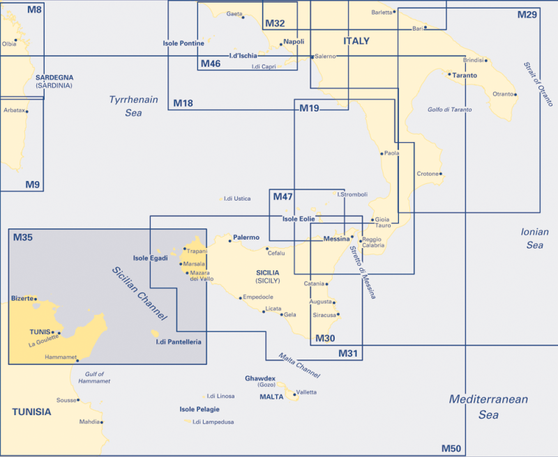 A brand new chart of the Sicilian Channel, designed to show passage from West Sicily to Isola di Pantelleria and the Tunisian Coast.