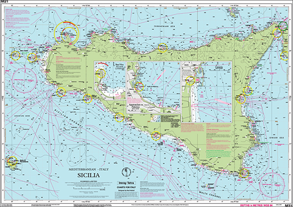 For this 2015 edition the chart has been fully updated with the latest known depth surveys, plus amendments to cables and navigational aids. The chart has been reschemed to show new plans of San Vito Lo Capo and Catania, and Isola di Pantelleria is now shown on the main chart. The plans of Marsala, Favignana and Trapani have been moved to a brand new chart, M49 West Sicily and Egadi Islands, also published in August 2015.