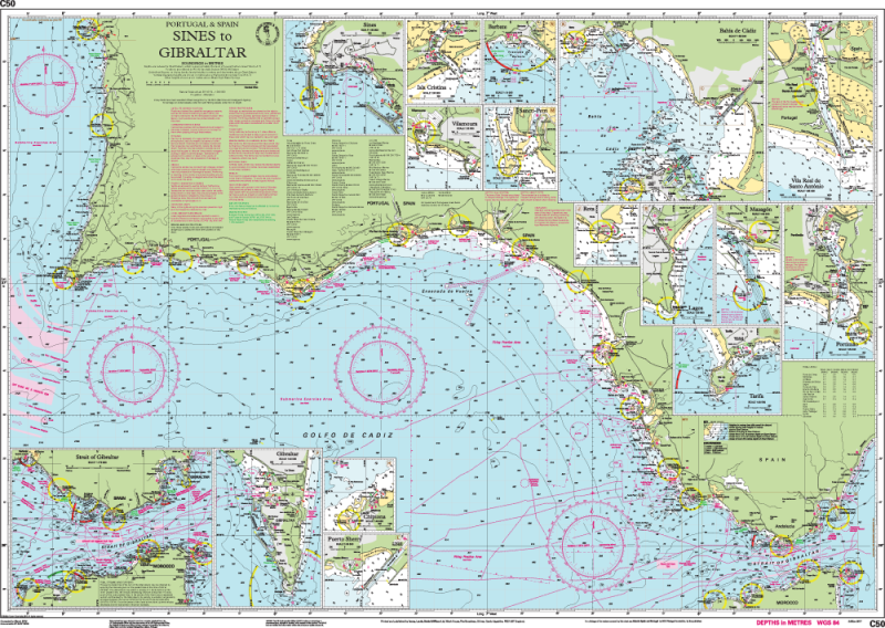 On this the latest depth surveys have been applied. Harbour developments in Gibraltar are included as are the latest firing practice areas in Golfo de Cadiz. The chart specification has been improved to show coloured light flashes. There has been general updating throughout.