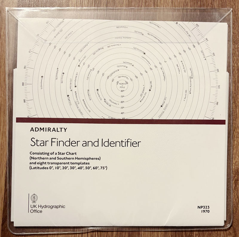 L’Admiralty Star Finder and Identifier comprende carte stellari per emisfero nord e sud e 8 maschere trasparenti per latitudini da 0° a 75°. Riporta 57 stelle del Nautical Almanac.