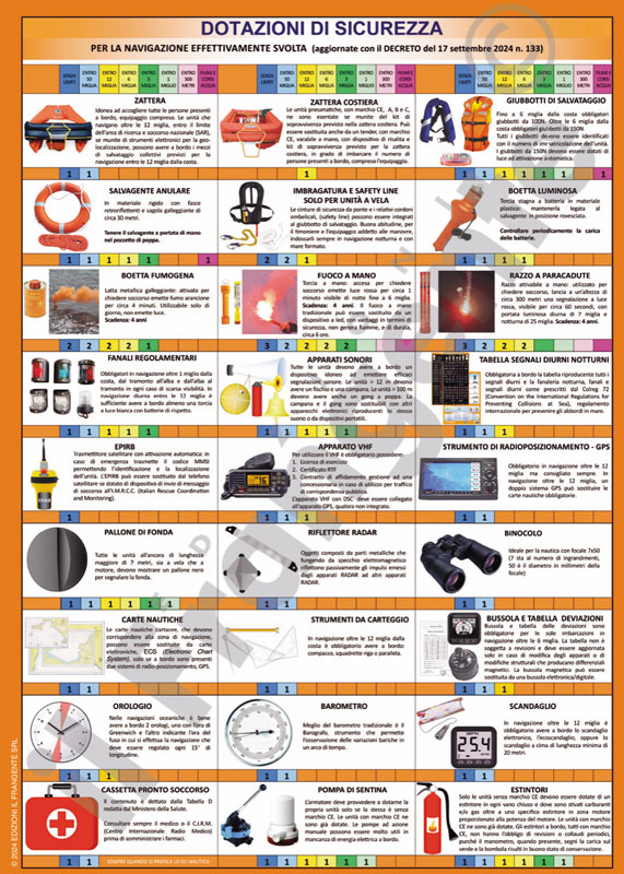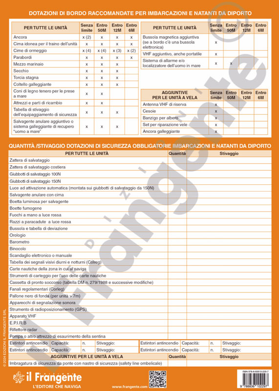 Una pratica scheda da tenere sempre a bordo che illustra le dotazioni di sicurezza obbligatorie per la navigazione effettivamente svolta, differenziate a seconda della distanza in miglia dalla costa. In scheda vi sono degli spazi per inserire la quantità di ogni singola dotazione presente a bordo e la relativa posizione di stivaggio, affinché tutti i membri d’equipaggio siano consapevoli della loro ubicazione. Sono indicate inoltre le dotazioni non obbligatorie, ma raccomandate ai fini della sicurezza a bordo, per imbarcazioni e natanti da diporto (ad esempio, cima idonea al traino dell’unità, coltello galleggiante, coni di legno tenero per le prese a mare, eccetera).