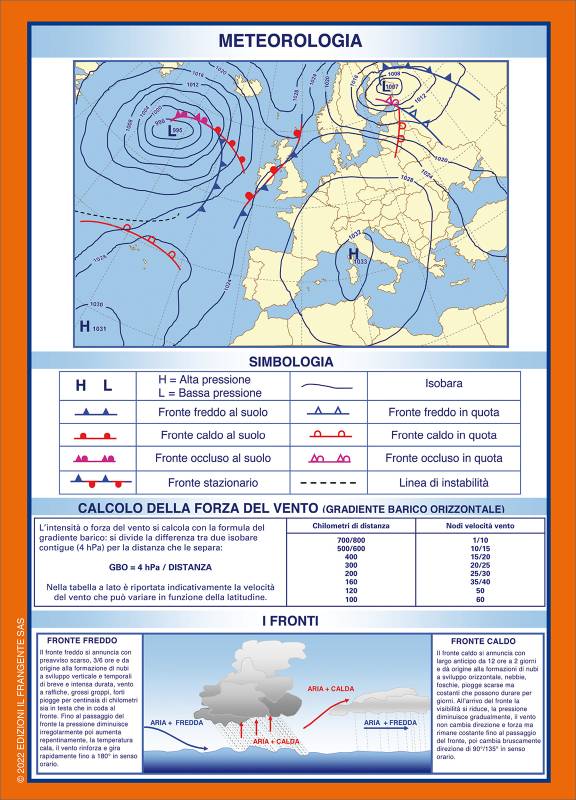 La scheda sul fronte raffigura le conformazioni bariche, le simbologie delle isobare e dei fronti con le caratteristiche principali del fronte freddo e del fronte caldo. Riporta inoltre una tabella del gradiente barico orizzontale.