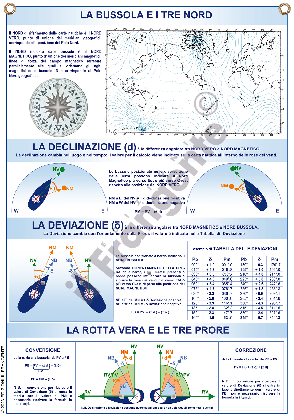 La bussola e i tre nord, il Nord Vero, la declinazione e il Nord Magnetico, la deviazione e il Nord Bussola. Formule di conversione e di correzione delle prore.