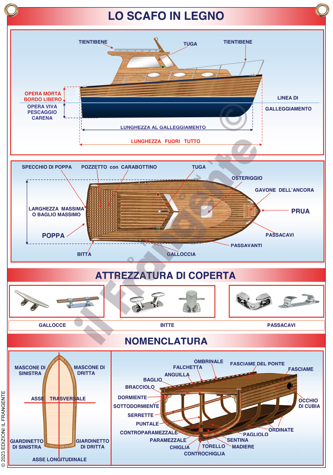 Descrizione dettagliata dello scafo in legno con nomenclatura delle singole parti e attrezzatura di coperta.