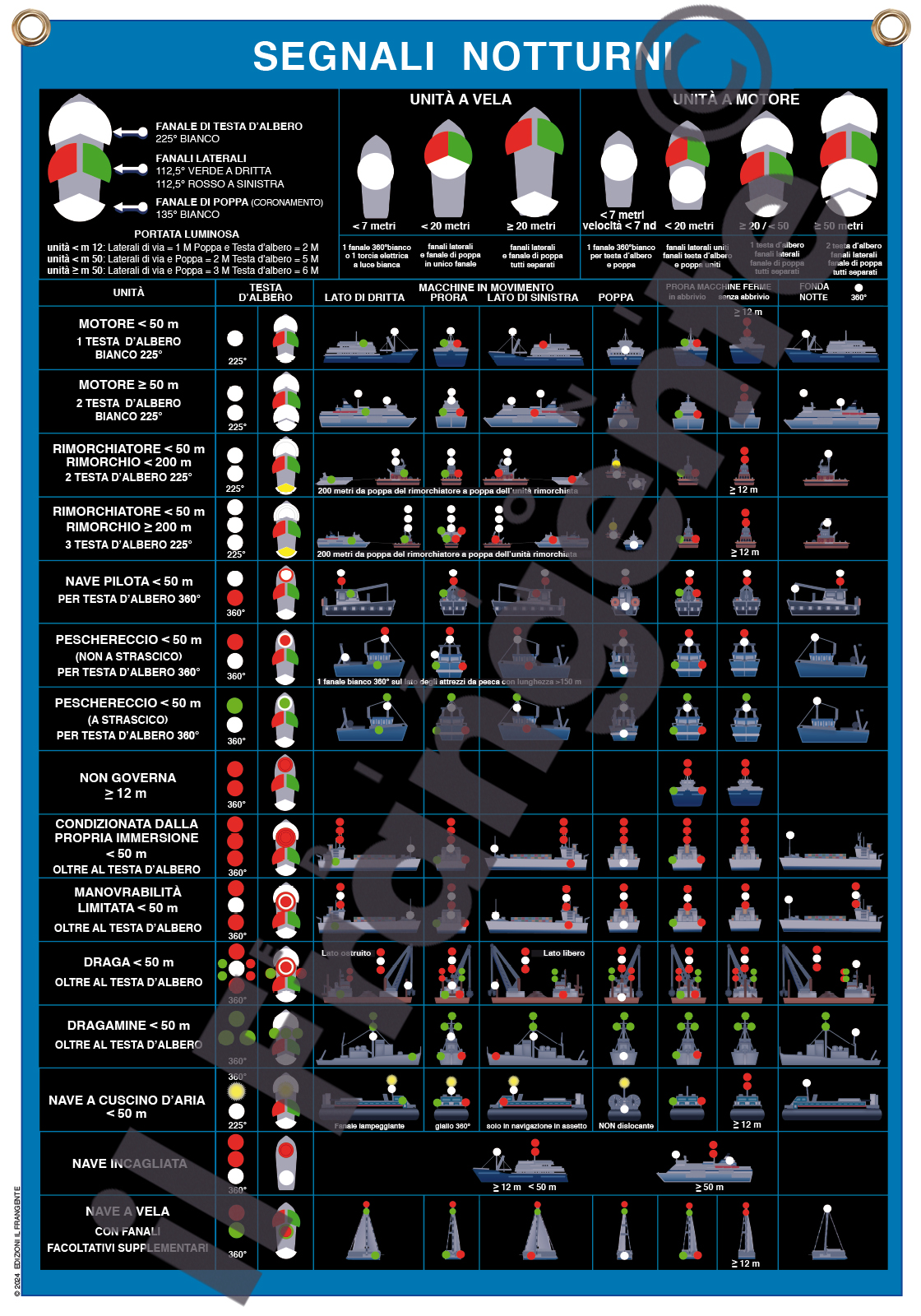 I fanali regolamentari delle varie tipologie di unità, settori di visibilità e portate luminose, schema riassuntivo dal regolamento internazionale per prevenire gli abbordi in mare.