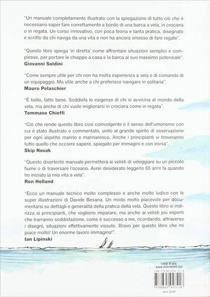 Davide Besana le barche le conosce. Oggi ha finalmente accettato di scrivere, e soprattutto disegnare, un manuale di vela completamente illustrato, e molto innovativo per linguaggio e struttura. Il lettore è immaginato non come uno studente, ma come membro dell’equipaggio che, partendo da un semplice nodo, procede attraverso le manovre e l’attrezzatura di bordo compiendo un’esperienza unica nel settore. Rinunciando magari a qualche nozione teorica di troppo, per privilegiare invece come si fanno le cose per bene in barca. Proprio quello che in genere manca nei corsi tradizionali. Il libro è tutto scritto e illustrato a mano, con uno stile unico che acchiappa il lettore che non si accorge nemmeno delle decine di nozioni che assume e impara per sempre, quasi fosse a bordo a tirare cime e prendere secchiate d’acqua.